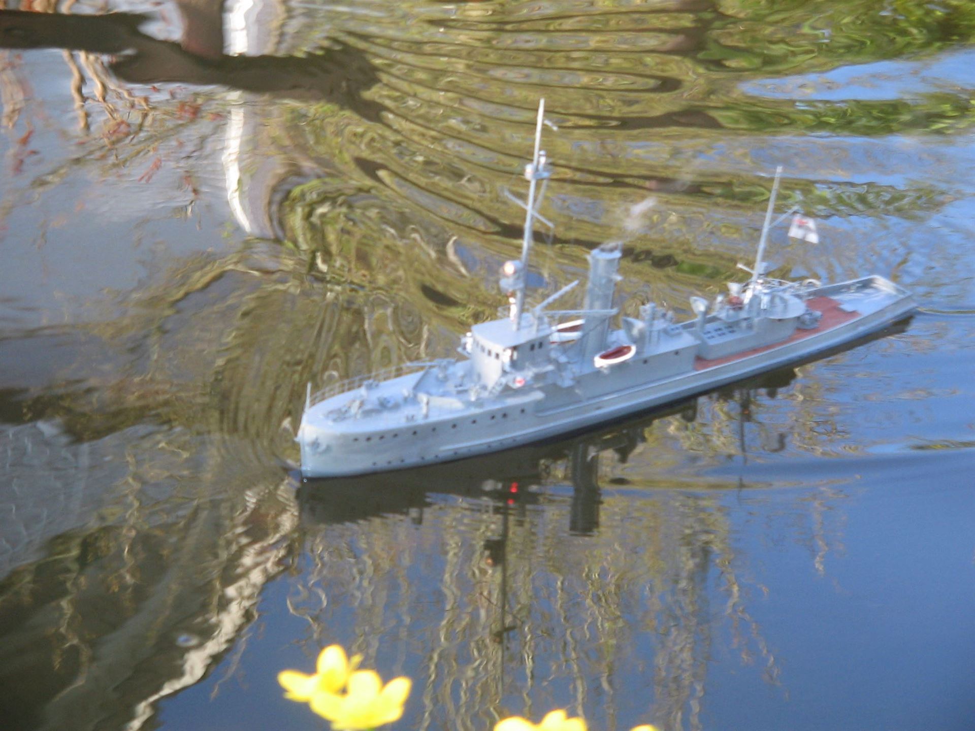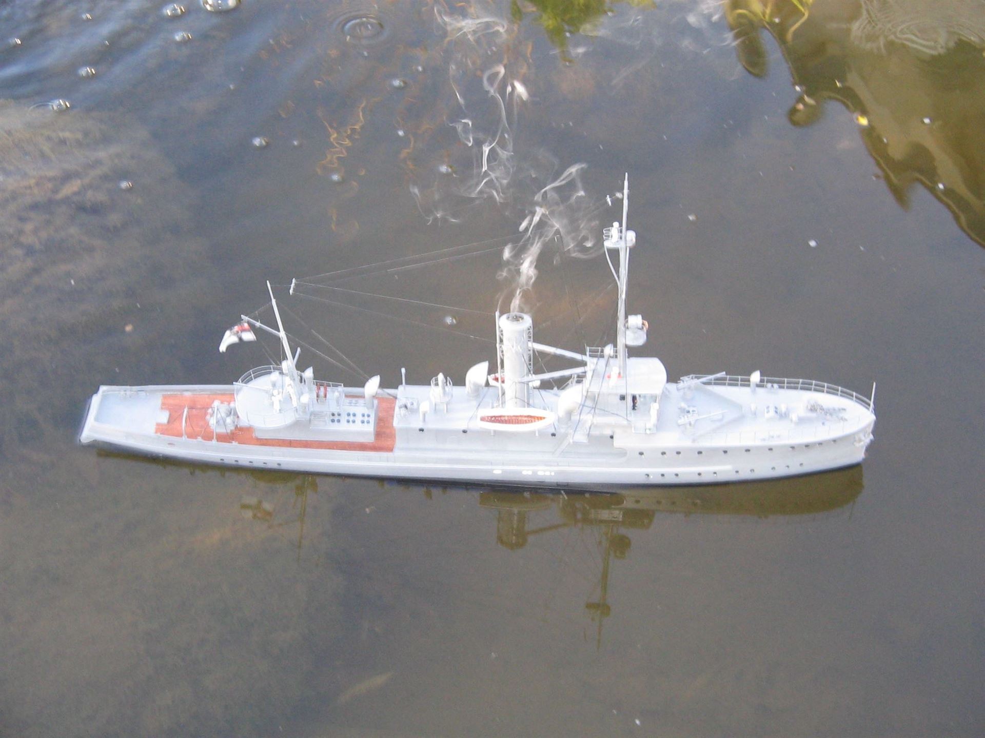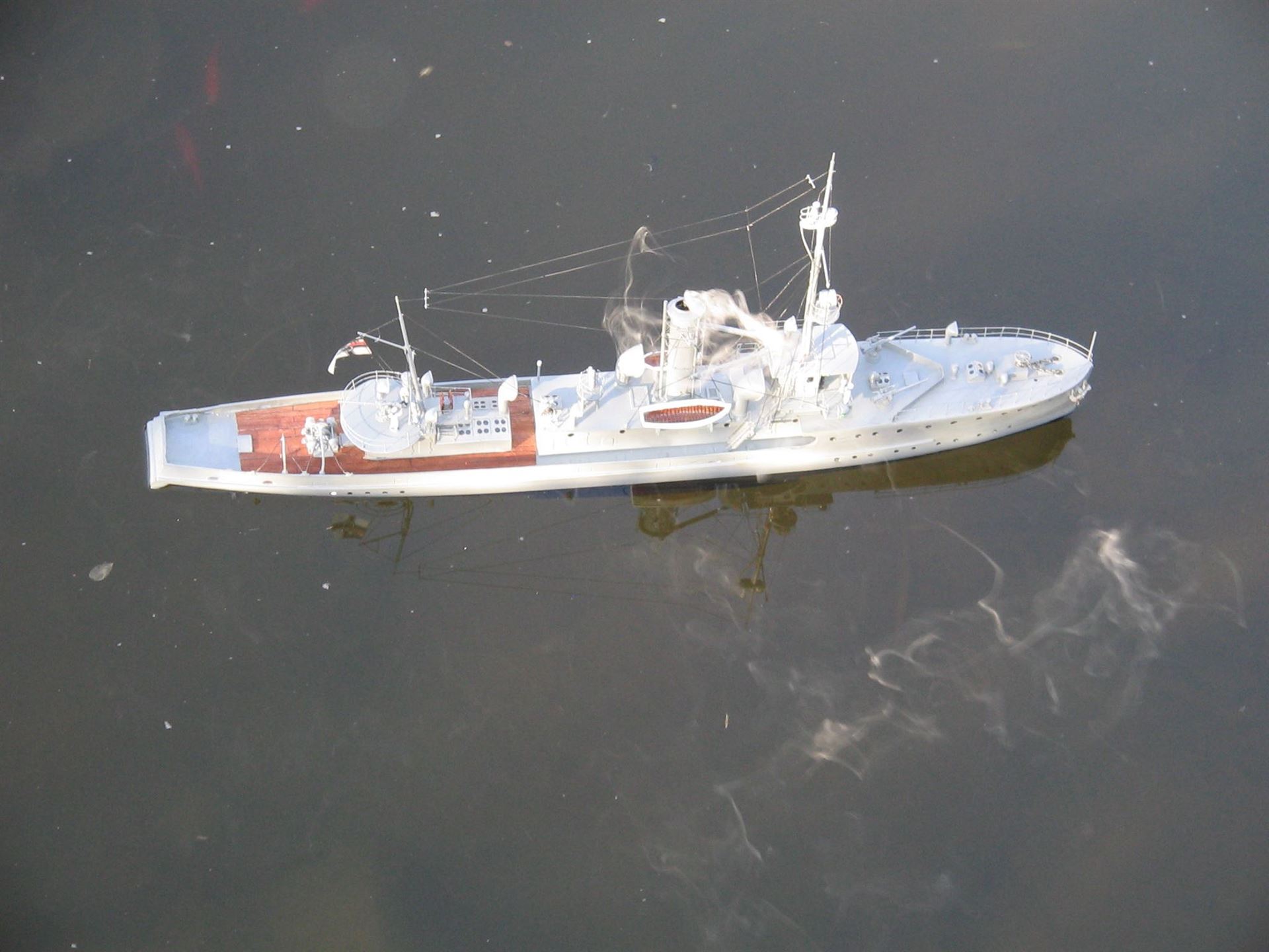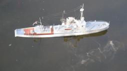 Das Modell war im Bau eine gewisser Herausforderung. Rumpf und Aufbauten sind aus Resin, teilweise sehr dickwandig, verschiedene Zurüstteile aus Zinnguss. Das bedinge nicht nur ein viel zu großes Gesamtgewicht, sondern auch eine sehr garstige Topplastigkeit. Es war daher unabdingbar, Material von Rump und Aufbauten durch Fräsen wegzunehmen. Viel Material. Trotzdem ist die Topplastigkeit immer noch reichlich fies und die Wasserlinie alles andere als Vorbildgerecht. Kurvenfahrten sind nur mit äußerster Vorsicht möglich.
