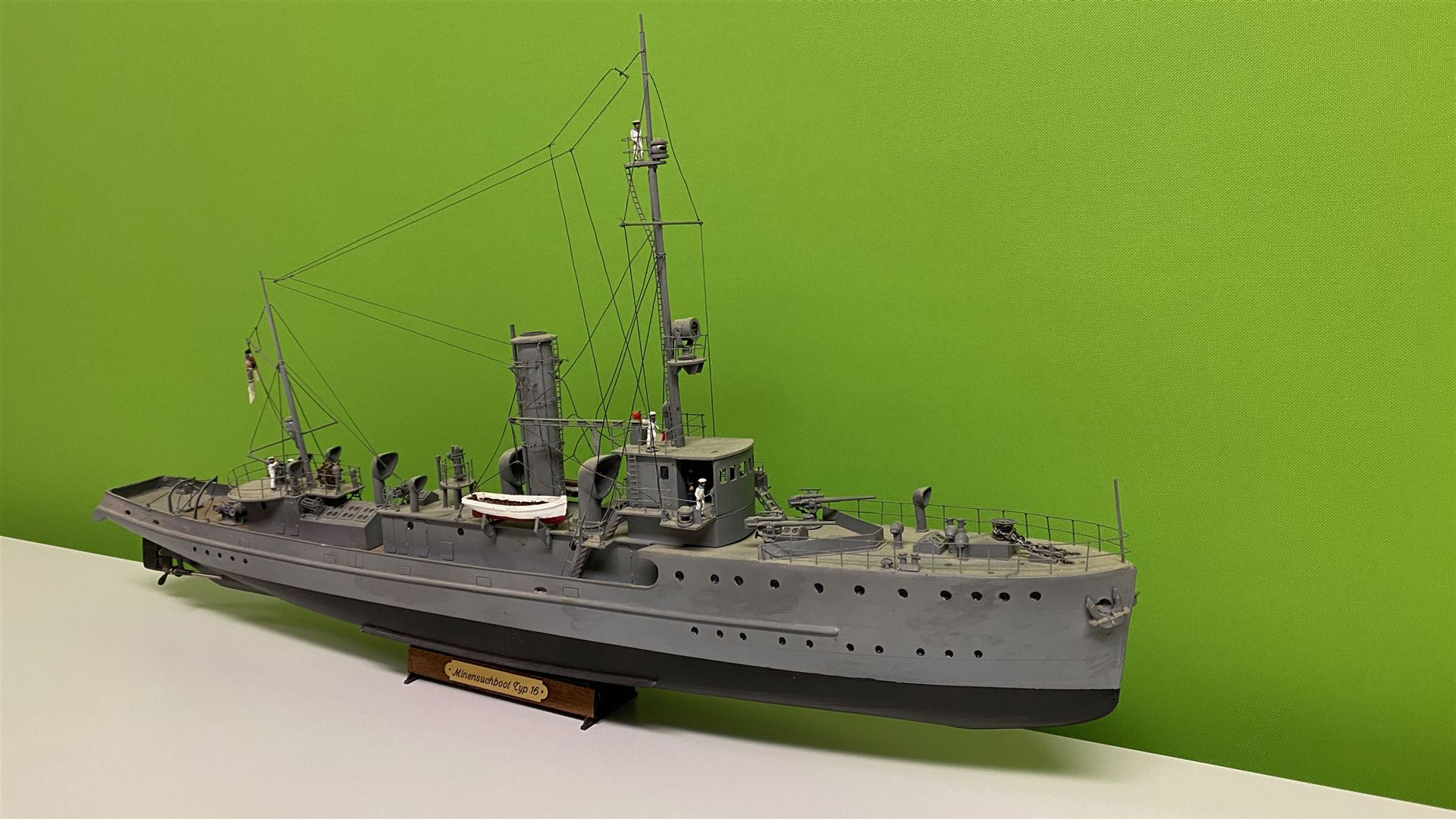 Das Boot ist in Hellgrau ähnlich Kriegsmarine Farbton 50 lackiert. Über den Anstrich von kleinen Überwasserschiffen der kaiserlichen Marine habe ich verschiedene Ausführungen gelesen. Besonders Torpedoboote und Minensuchboote waren nach mehreren Quellen schwarz gepönt. Andere Quellen berichten aber von einem gauen Anstrich. Es scheint so, dass der schwarze Anstrich vor allem in den frühen Kriegsjahren geführt wurde und später auf grau umgestellt wurde. Bilder lassen beides zu. Nach meinem heutigen Wissenstand hätte ich einen dunkelgrauen Anstrich ähnlich Kriegsmarine Farbton 51 Dunkelgrau, wie alle Einheiten ab 1944 gestrichen waren, verwendet. Als Alternative käme tatsächlich auch mattschwarz in Betracht.